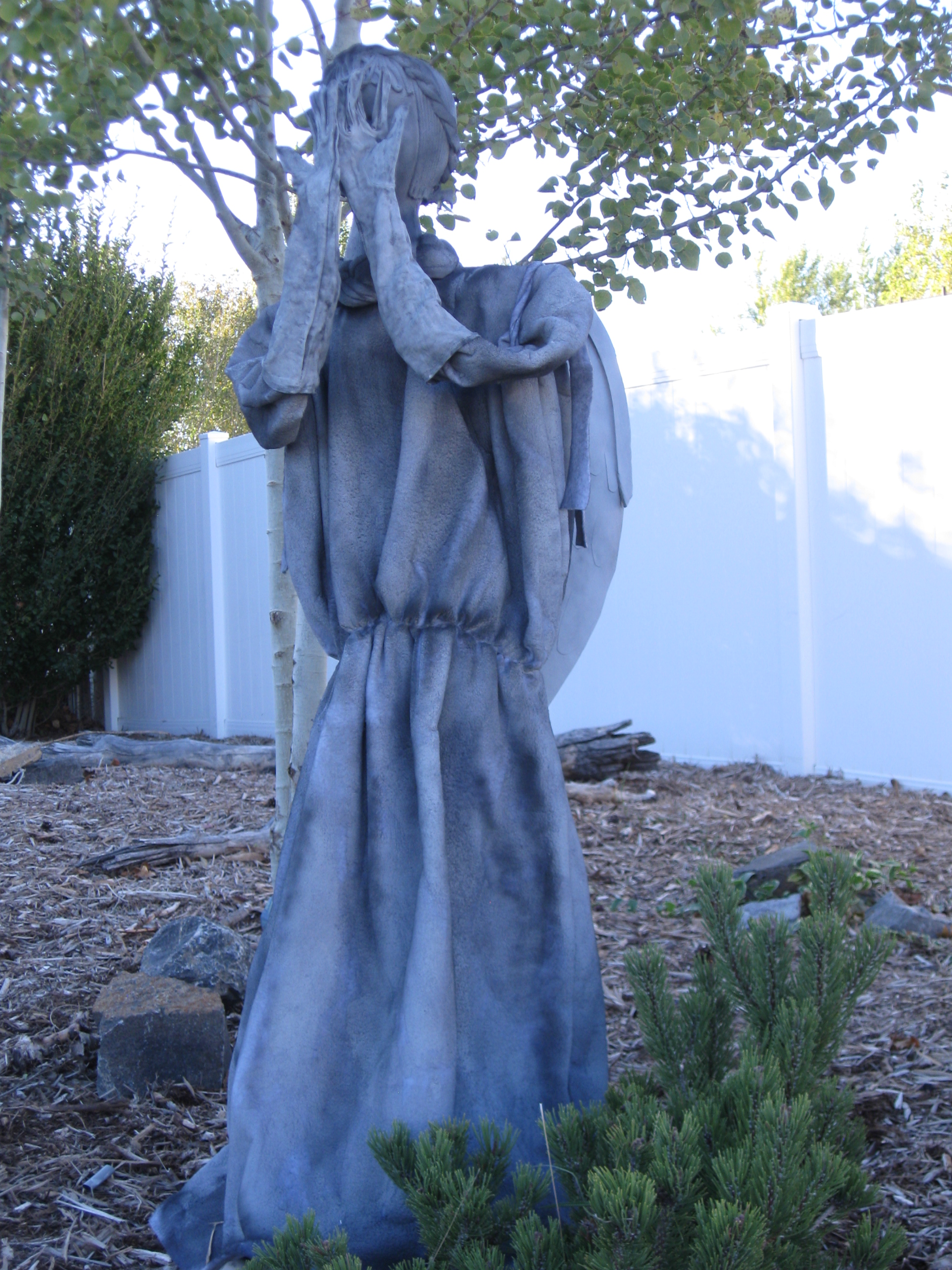 It should have been simple enough. Make a simple gray dress, put it on a framework of pvc pipe, paint her head and stick it on top, paint long gloves for hands, and attach wings.