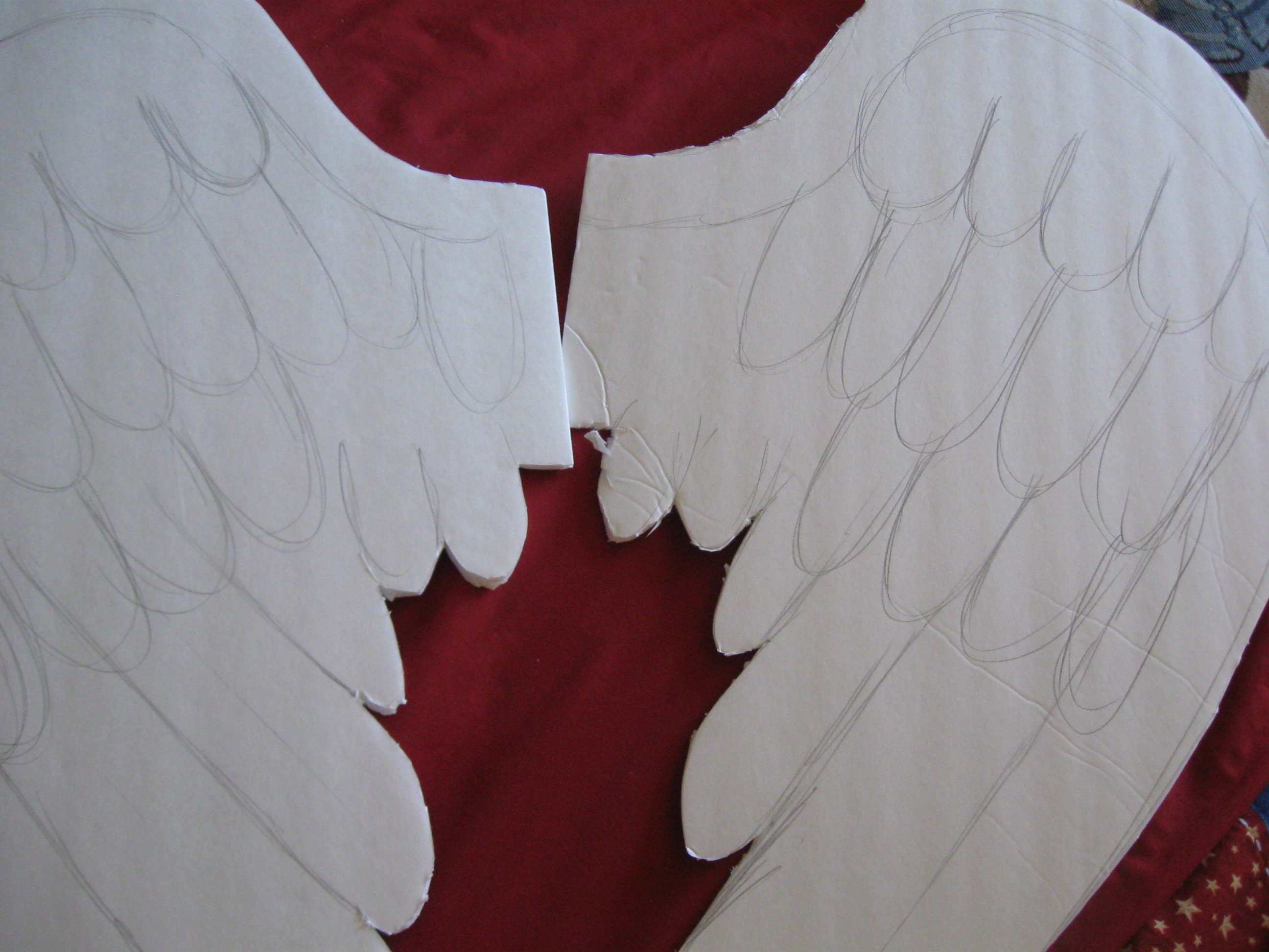 As for the wings I purchased foam core boards, and cut out a wing shape. Later, I discovered a razor blade is far, far easier than using scissors. I sketched on the scallop of the wings, then using thin plastic, I cut out the feathers and glued them on to the wings, trying to create a layered affect.