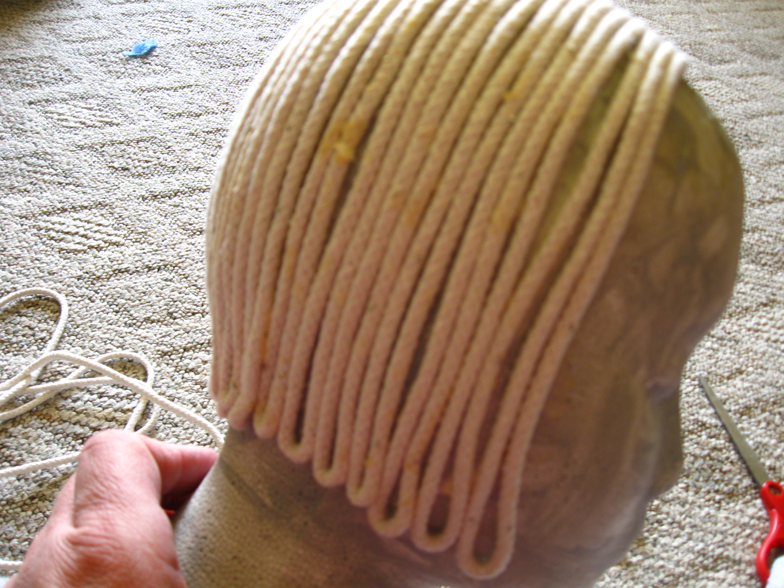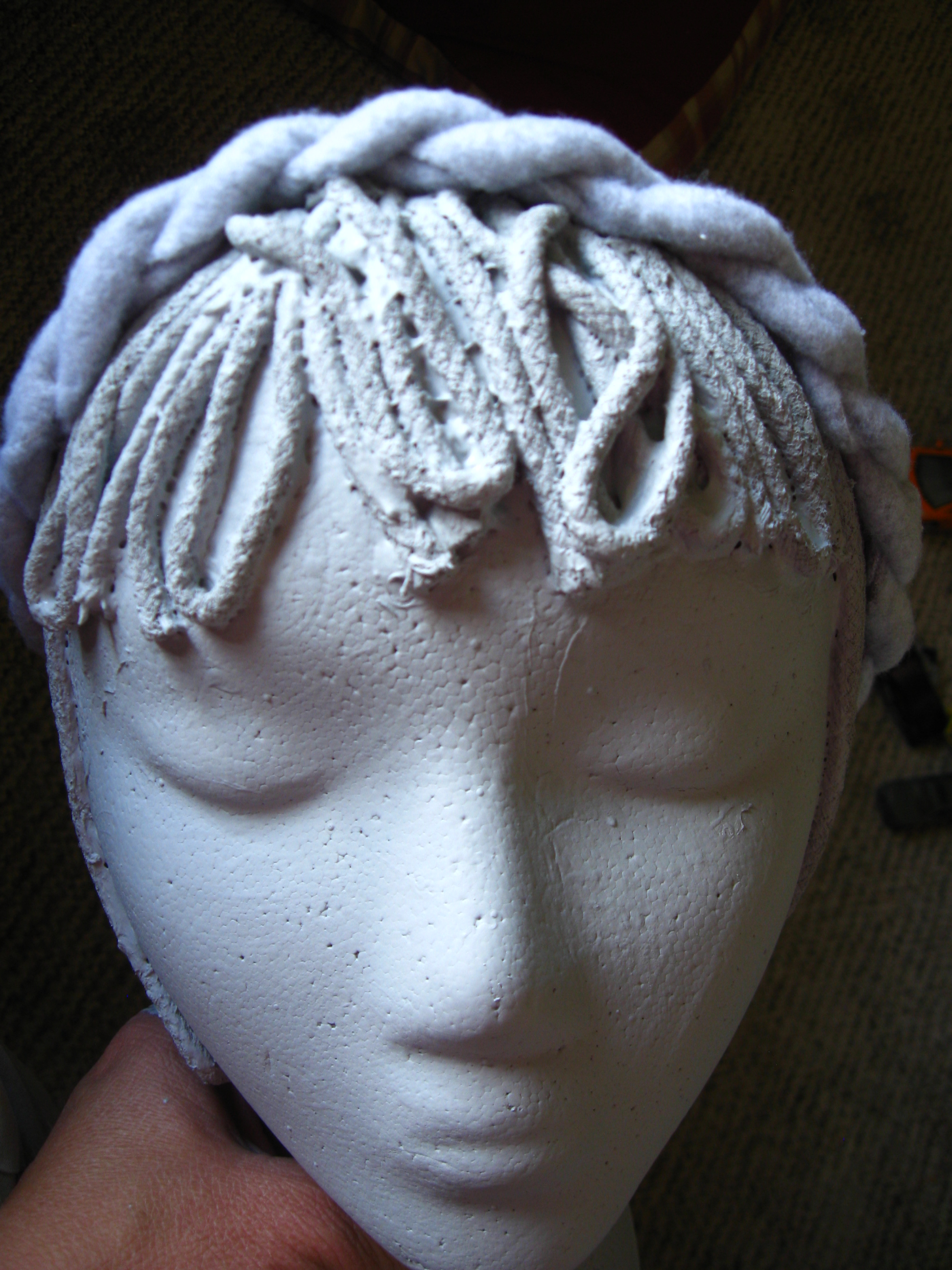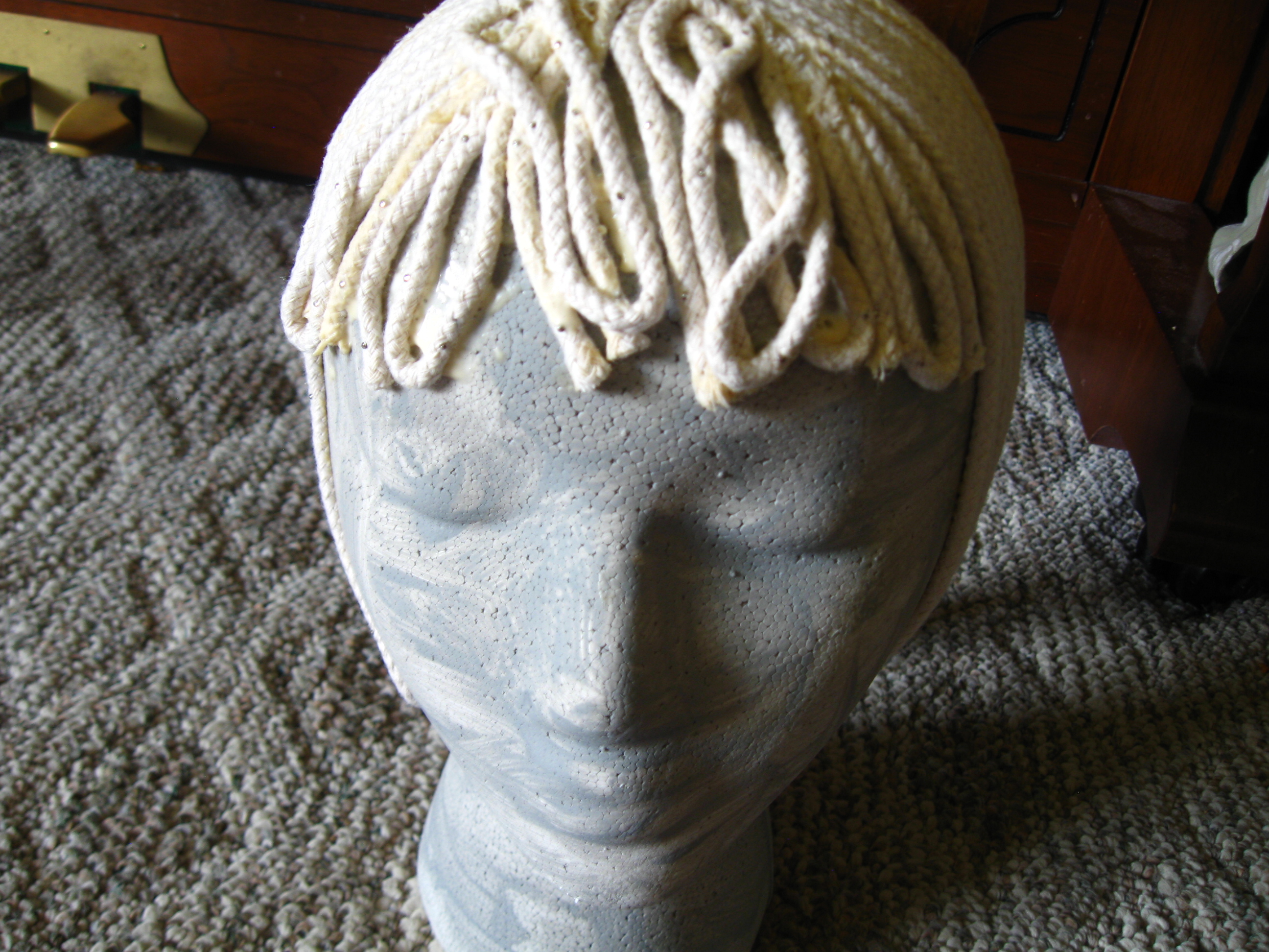 The head was easy enough. Using wood glue, straight pins, and rope, I glued on her hair, securing it with pins (foam doesn’t scream when you stab it).