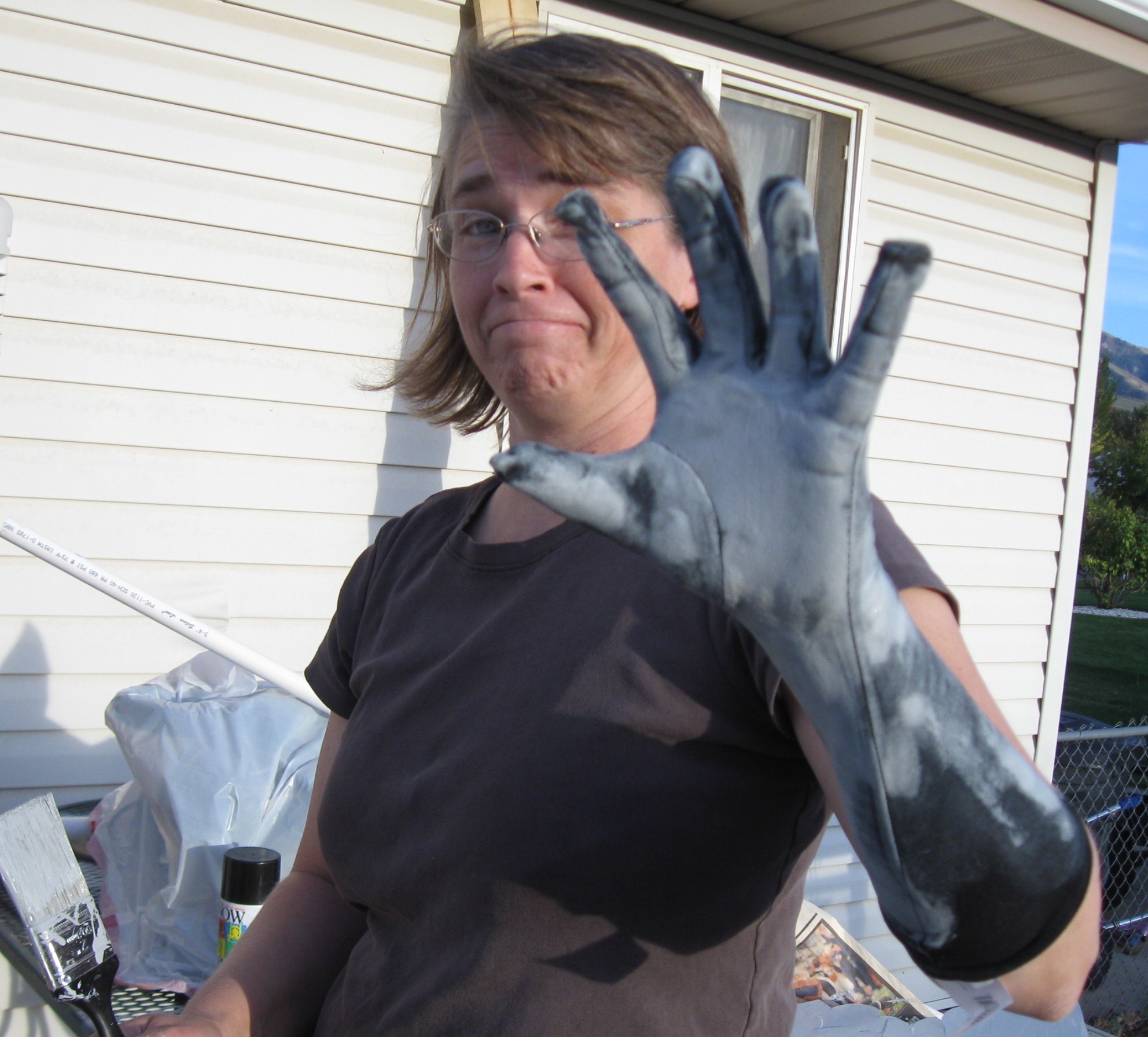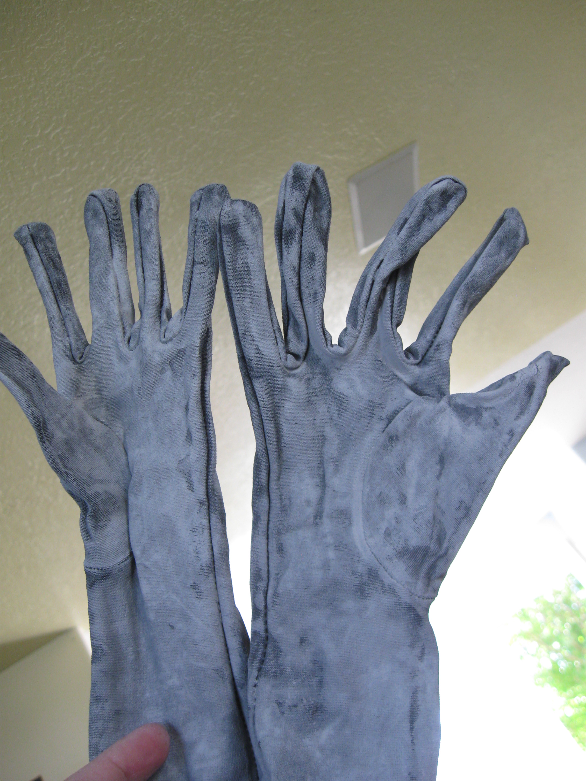 Well, I couldn’t screw up the arms and hands too badly, right? I purchased long gloves from Walmart, and painted them gray with the very good latex exterior paint.