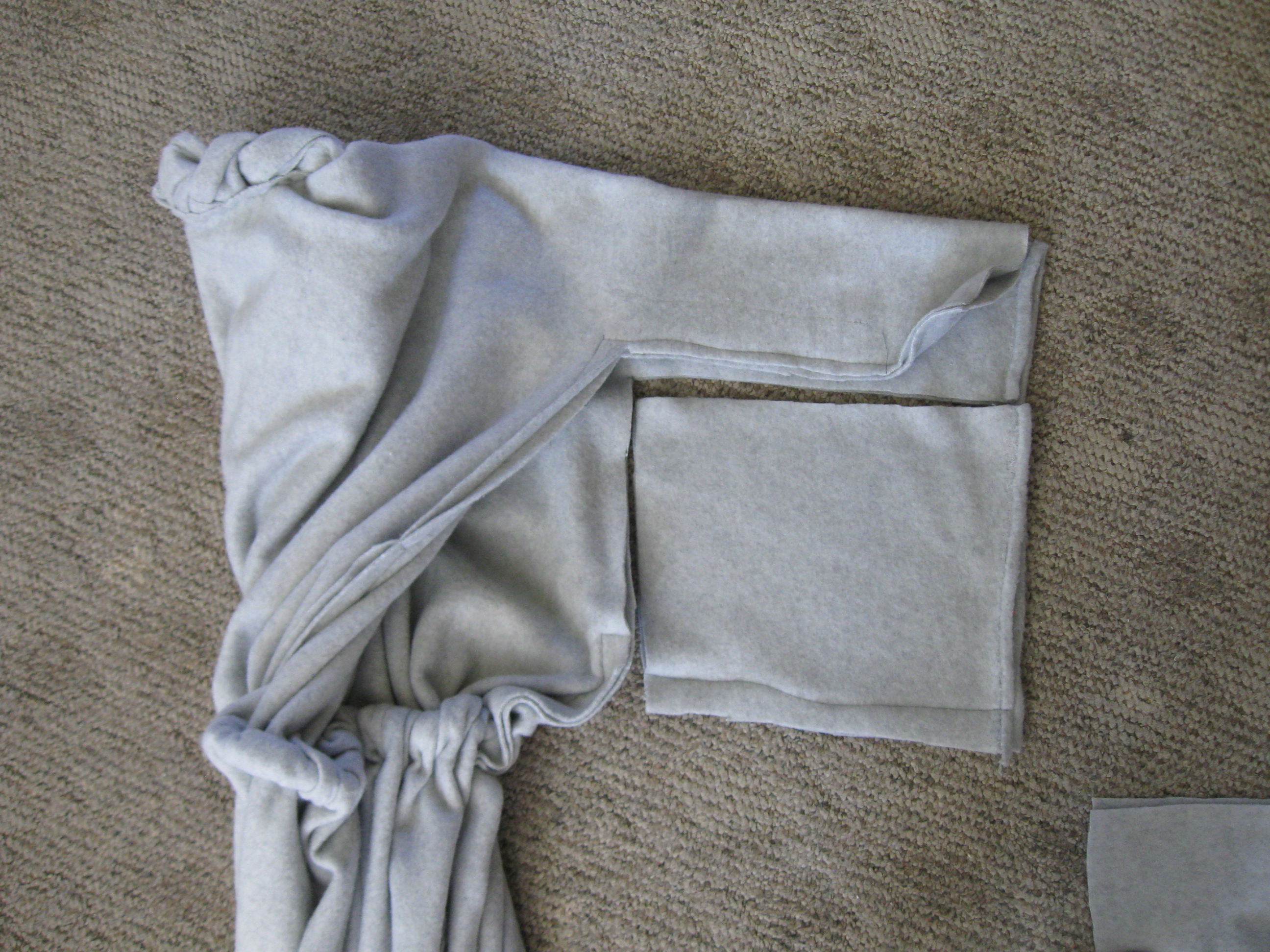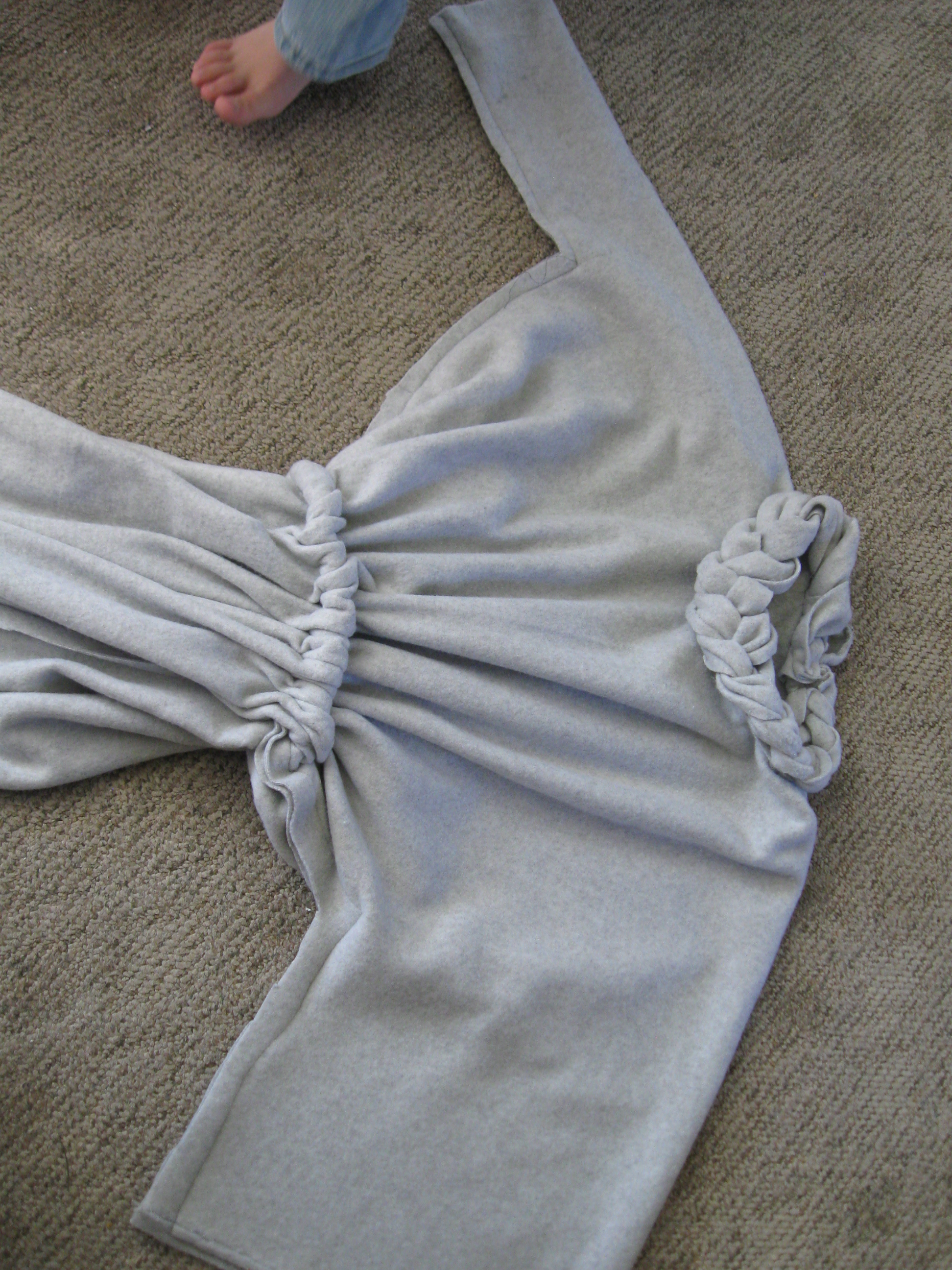 (Excuse my son’s foot photo-bombing.) I cut a simple T, cinched in the waist, and put a braid of woven leftover fabric around the neck as a decorative touch, and also to try to camouflage the fact that I cut the hole for the head too big.