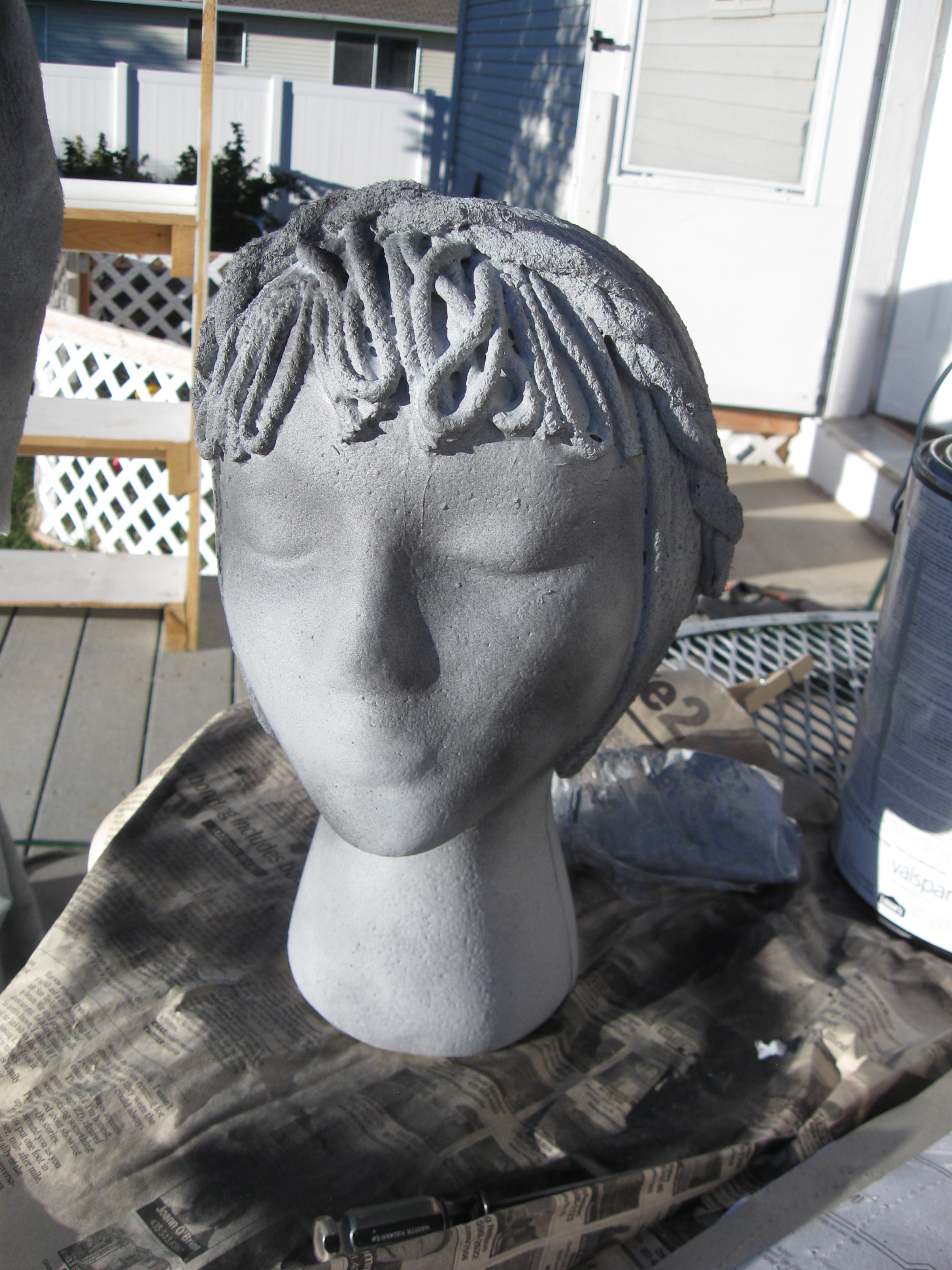 Soon she had a lovely head of hair that looked like cut stone, especially when I coated it with a layer of exterior latex paint, tinted the same color as the fabric I purchased for her dress.