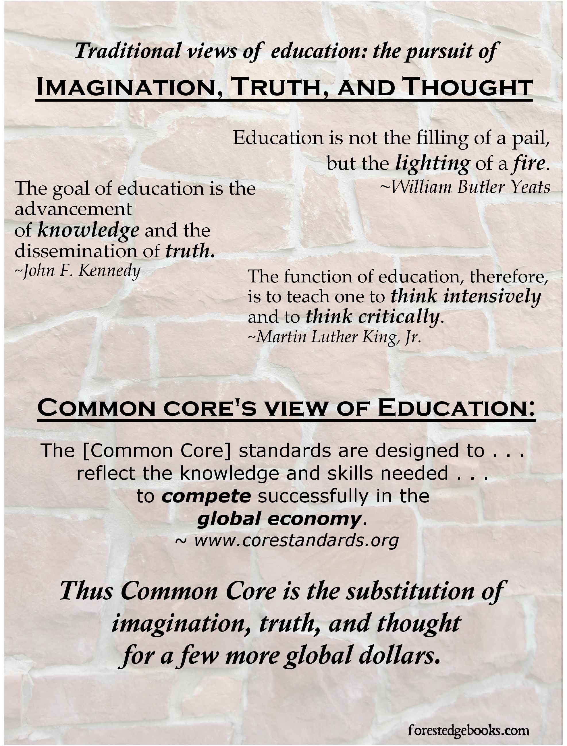 I drafted those words—the question of a school teacher in a different time and in another world—over four years ago, before I knew anything about Common Core Curriculum. As a homeschooling mom since 2002, and a college composition instructor, I’d developed my own concerns about public education long before I was forced to confront Common Core head on. But the worries I had then about schooling have now festered into an ulcerous wound.